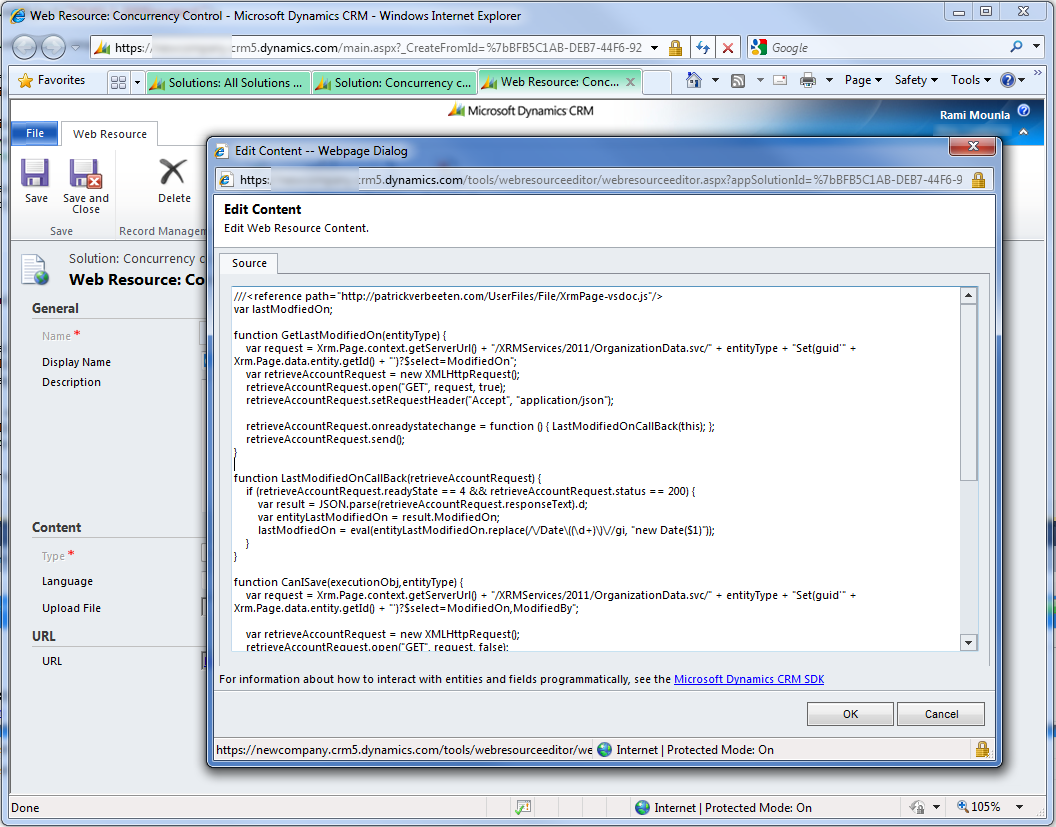 In the following solution I will use a JavaScript script library to create concurrency control in CRM 2011. The JavaScript will execute twice. The first time on the load event it will register the current date and time. The second time on save it will check if we are online and call the CRM 2011 REST services to check if the ModifiedOn field has been updated past the time we register on load.